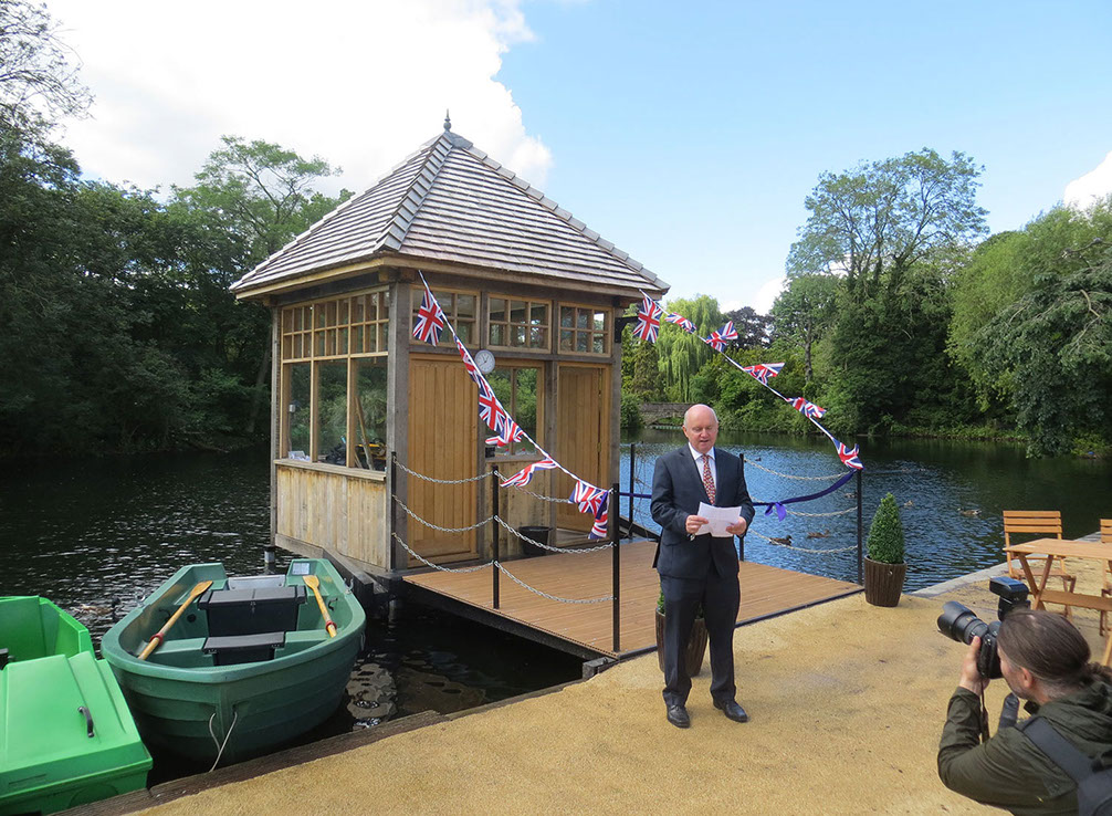 New glazed kiosk, set within the lake itself, approached over a drawbridge,